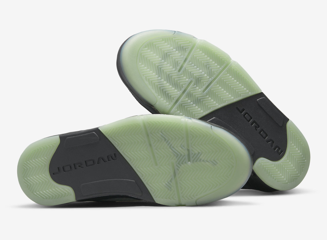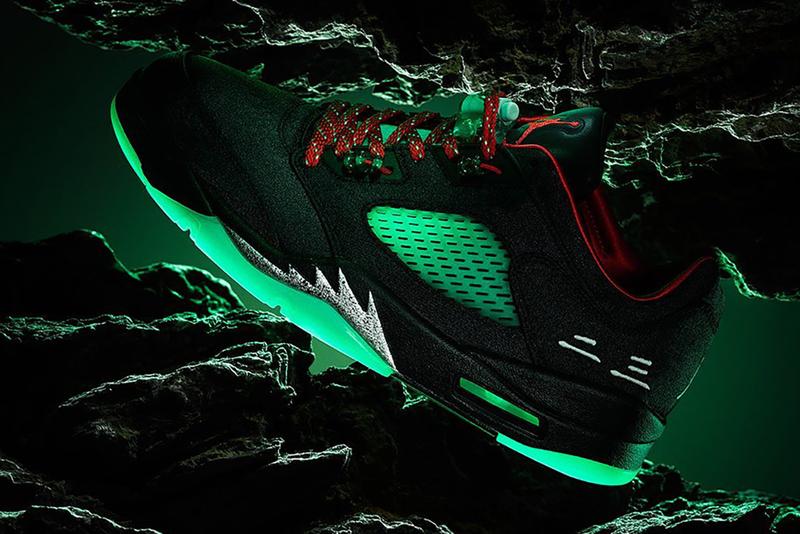 靴を持ち上げるのは、斑点のあるメタリックシルバーのサメの歯のデザインと、ブランドのグローインザダークラバーミッドソールを備えたブラックのエアアシストミッドソールです。各シューズには、翡翠の色と模様を表現した特別なジョーダン ブランドのシューズボックスが付属しています。