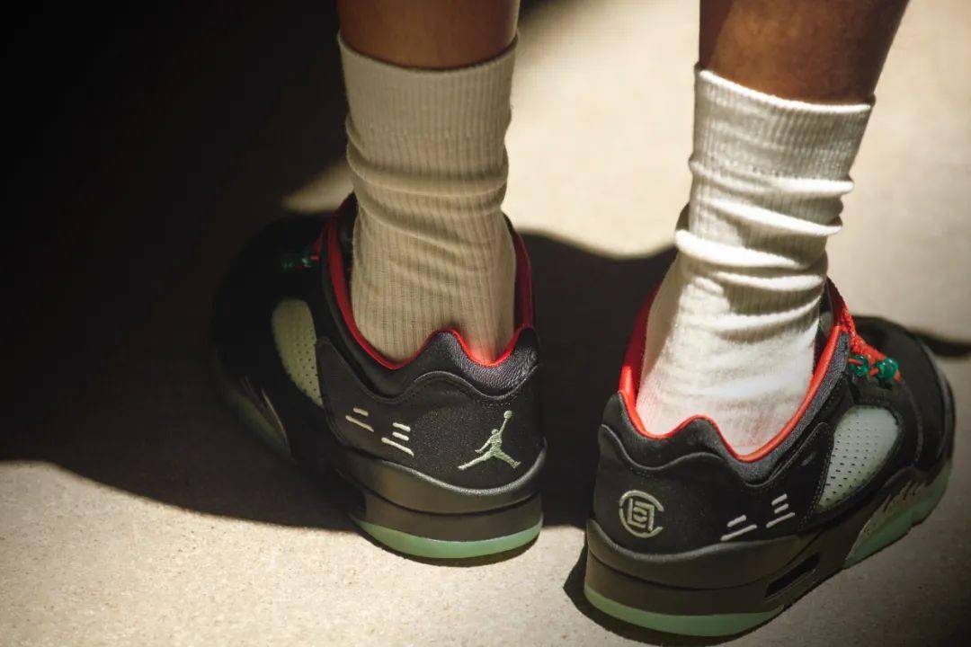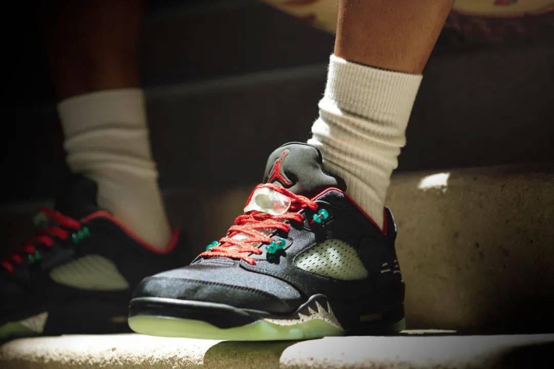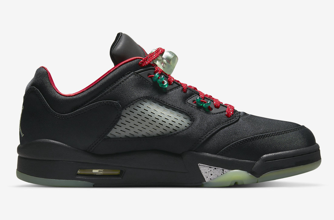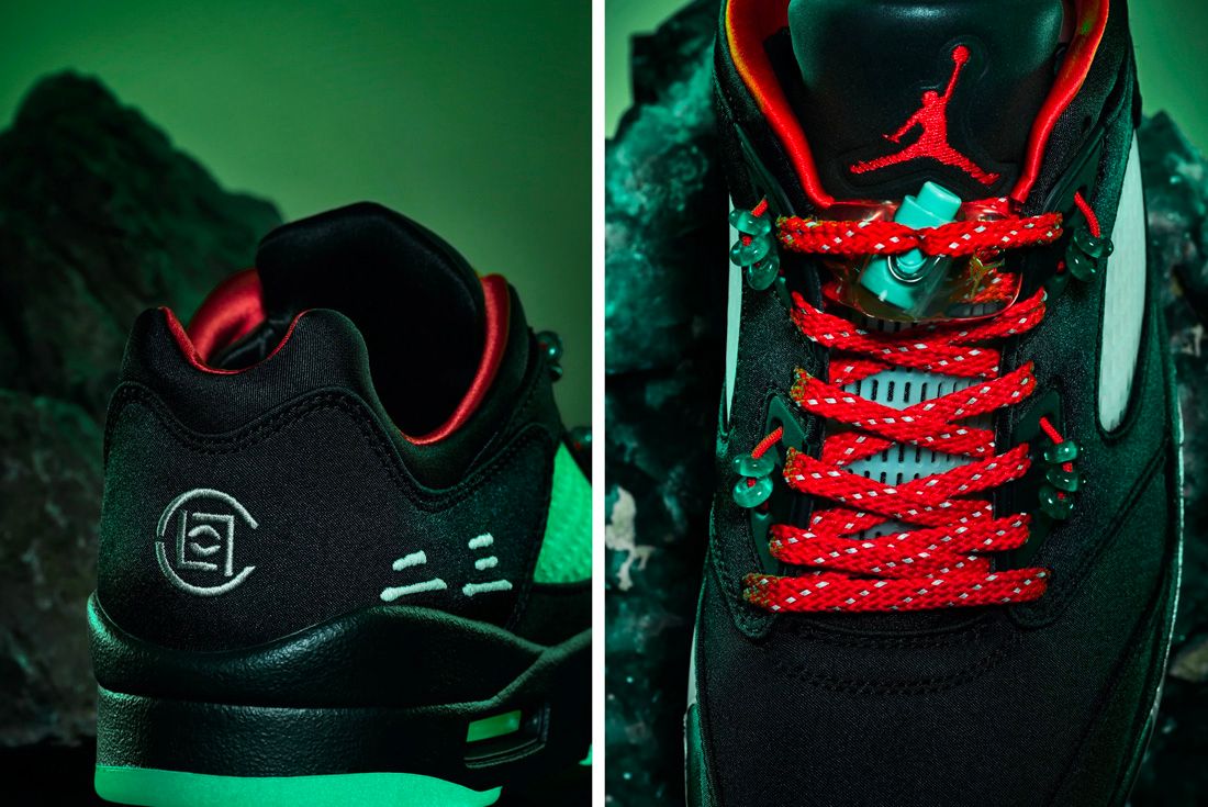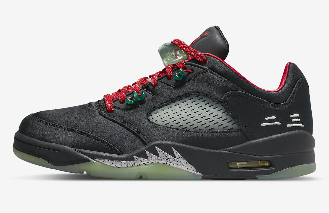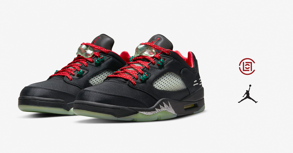 CLOT x エア ジョーダン 5 LOW “ジェイド” は、鮮やかなブラック サテンのアッパーに、反射するシュータンとヒスイをイメージしたオーナメントがアクセントになっています。シグネチャーのAJ5レースロックは、暗闇で光る品質の翡翠の半透明の美しさを表現し、レーシングシステムに配置された「2-3」の翡翠のビートです。追加のディテールは、かかとに中国語で刺繍された「23」、暗闇で光る足中央部のネット、特別な赤い靴ひも、プリントされたインソール、対照的な赤い中敷きの形で提供されます。